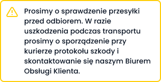 Будь ласка, перевірте Вашу посилку перед отриманням. У разі пошкодження під час транспортування, будь ласка, складіть акт про пошкодження разом з кур'єром і зверніться до нашої служби підтримки клієнтів.
